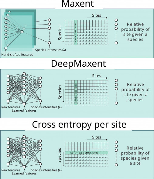 The new method relies on a normalised Poisson point-process loss, enabling scalable training with stochastic gradient descent and efficient multi-species modelling while accounting for spatial sampling biases. As a result, DeepMaxent improves predictive accuracy compared to classical Maxent and opens new opportunities for large-scale, multimodal biodiversity monitoring using deep learning.