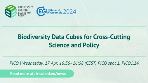 Keep an eye out for the PICO session delving into Biodiversity from a Geoscience perspective, where B-Cubed will be presented by project partner Lina M. Estupinan Suarez – “Biodiversity Data Cubes for Cross-Cutting Science and Policy”, PICO | Wednesday, 17 Apr, 16:56–16:58 (CEST) PICO spot 1, PICO1.14.