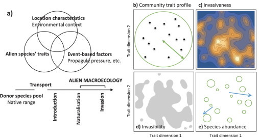 B-Cubed is excited to announce the publication of the first paper supported by the project – Disentangling the relationships among abundance, invasiveness and invasibility in trait space. The paper sheds light on the fundamental question of how introduced species transform from rare occurrences to thriving invaders. It introduces a comprehensive three-pronged invasion framework that brings together traits, environmental context, and propagule pressure to provide a nuanced understanding of invasiveness dynamics.