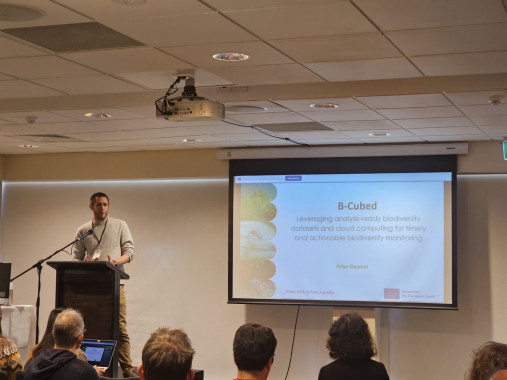 Among the conference’s attendees were several B-Cubed members, including Peter Desmet (Research Institute for Nature and Forest) who introduced the audience to the project. Kicking off his presentation, Peter provided a concise overview of B-Cubed’s context and its underlying objective. To support improved policymaking, abundant biodiversity data is indispensable. And while a lot of data is already collected and shared through facilities such as GBIF, there is still a long way from downloading data from GBIF to transforming it into actionable policy information. B-Cubed aims to standardise this workflow, making it more efficient and repeatable.